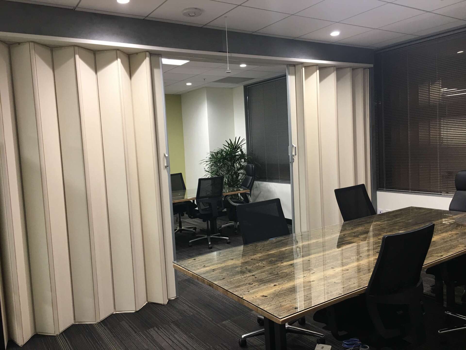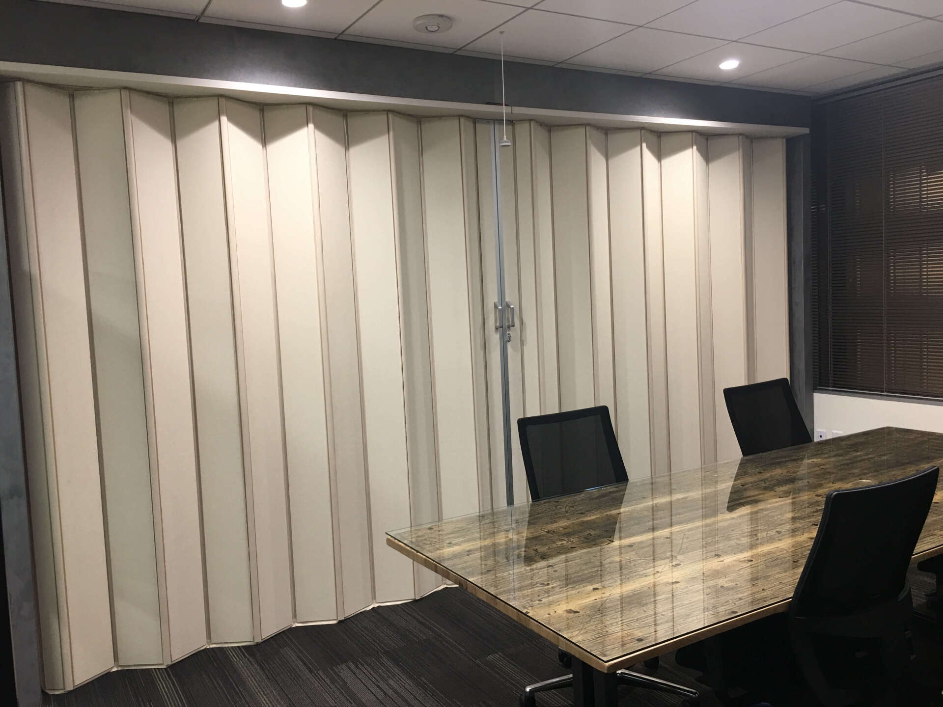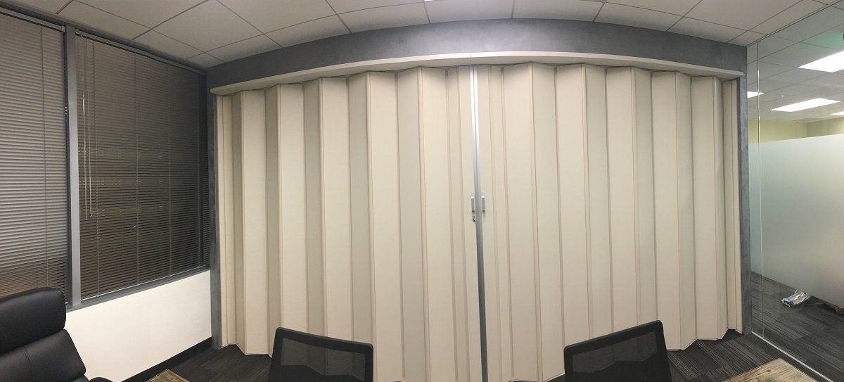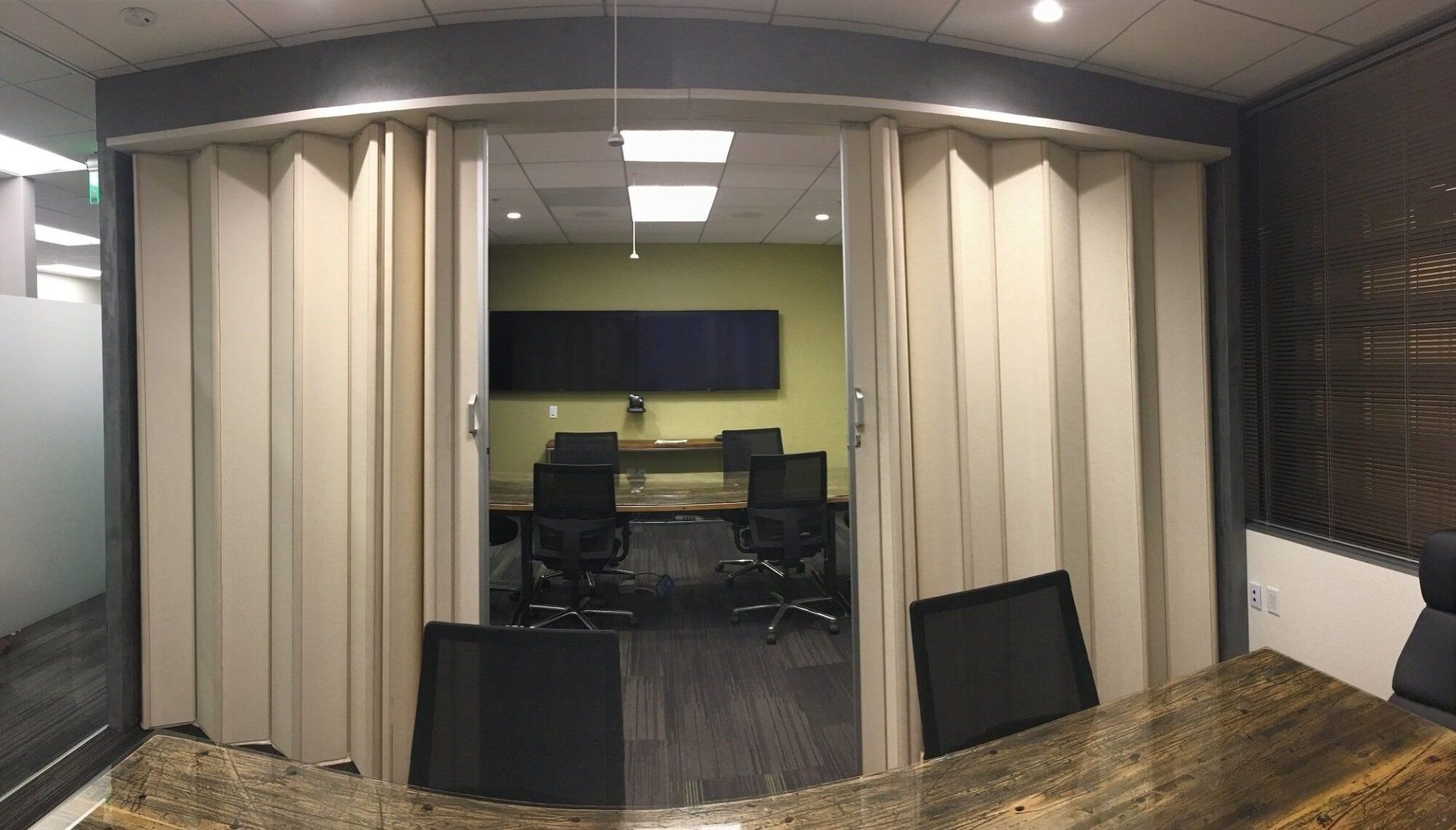 This project was changing the layout of a large conference room into two smaller rooms by adding an acoustical accordion door hung on a strong new built frame.